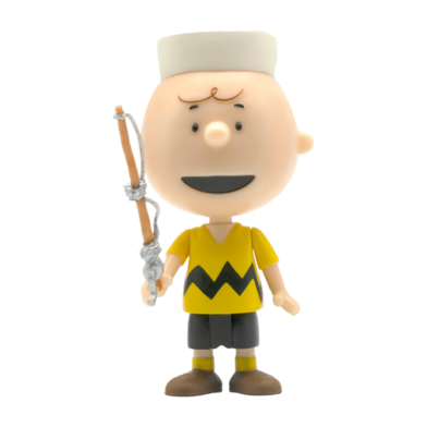 Charlie Brown sports his camp hat and comes with a fishing-pole, the line a frustratingly undoable knot!