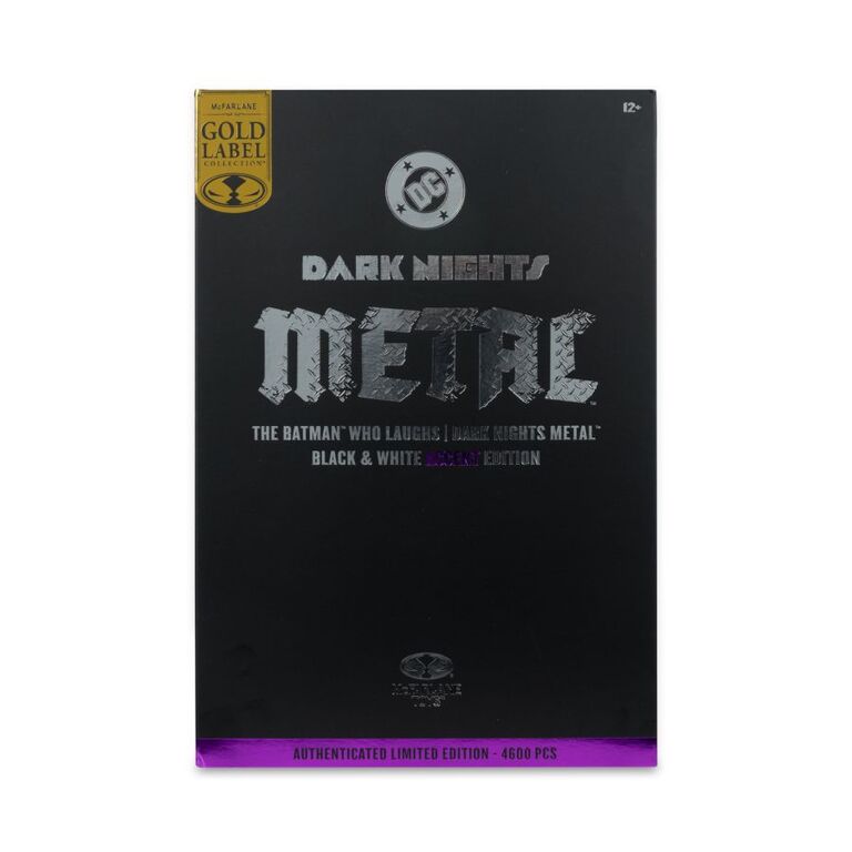 – The Batman Who Laughs is featured in black and white deco with pops of purple accents