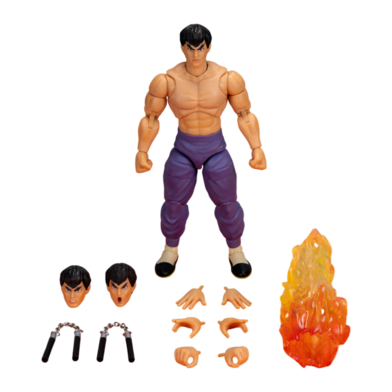 Street Fighter – Fei Long (P2) Deluxe 6" Action Figure comes equipped with alternate hands, head, combat accessory, and stand.