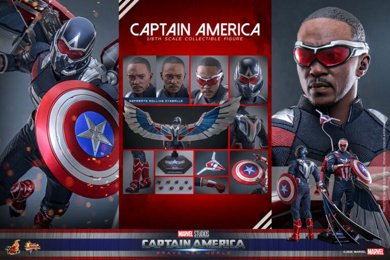 Faithfully crafted based on Anthony Mackie's portrayal of Captain America in Captain America: Brave New World, the new 1/6th scale Captain America Collectible Figure features a newly developed head sculpt with separate rolling eyeballs and a pair of aviation goggles, a helmeted head, a finely tailored red, blue, white tactical Cap's suit, a flight backpack, a newly painted Captain America shield with silver star emblem, his signature set of newly painted mechanical wings with articulation function, a Redwing drone and a specially designed dynamic figure stand with character nameplate.