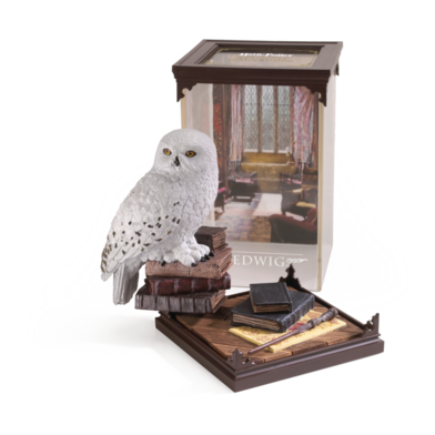 A finely crafted diorama of Hedwig, Harry Potter’s owl, given to him on his eleventh birthday by Hagrid. Hedwig is perched atop a pile of books.