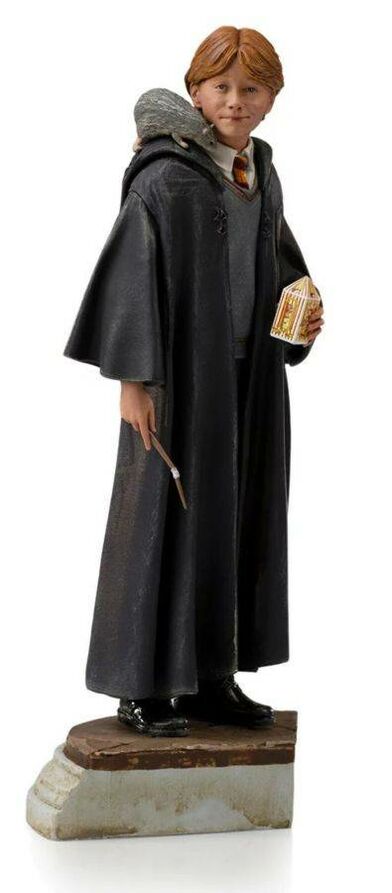 The Iron Studios presents the "Ron Weasley Art Scale 1/10 Statue – Harry Potter – Iron Studios", with an incredible resemblance to the actor Rupert Grint, with his unforgettable expressive smile, wearing his school uniform inherited from his brother Bill, holding in his right hand the old magic wand patched from his brother Charlie, with his box of magic beans on his left and his pet rat Scabbers on his right shoulder, who belonged to his brother Percy.
