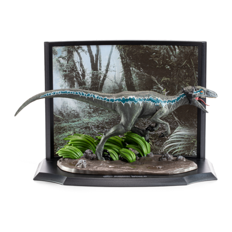 This diorama features velociraptor Blue from Jurassic World (2015) on the hunt for the Indominus Rex, complete with headset.