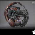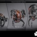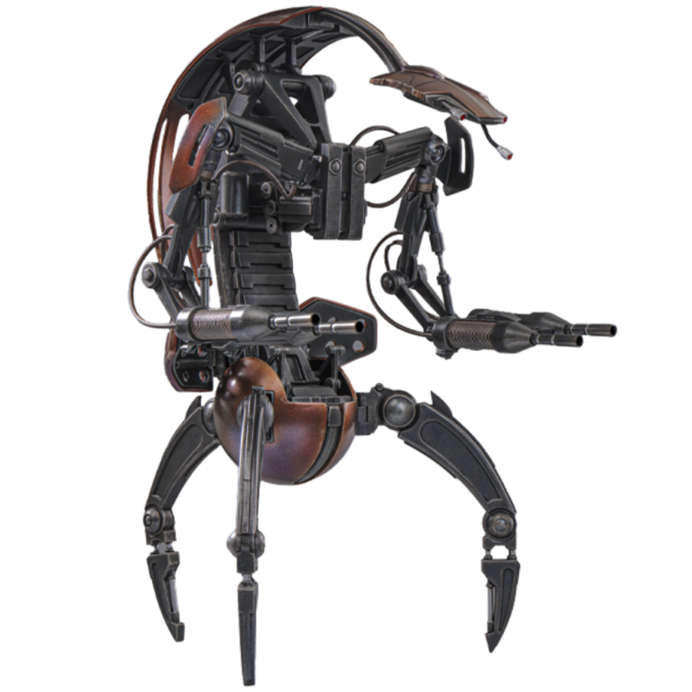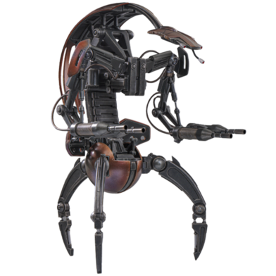 Unlike the spindly battle droids, whose humanoid builds allow them a degree of versatility, droidekas are designed with one sole function in mind: the complete annihilation of their targets. Slung at the end of heavy arms are immense twin blasters, which unleash destructive energy at a pounding pace. The destroyer droid can completely envelope itself in a globe of protective energy via its compact deflector shield generators, though at the expense of its mobility. Although slow and awkward on its three-legged gait, the droideka can transform into a much speedier, disk-shaped form.