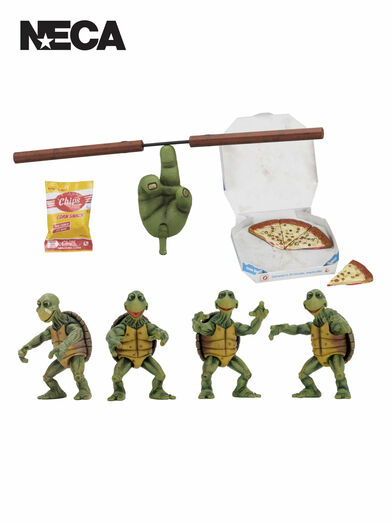 After wading in a puddle of radioactive waste, these radical reptiles are transformed into New York City’s greatest crime-fighting quartet! The Baby Turtles are still tiny but ready to train with their master Splinter. These detailed, poseable figures stand 4″ tall, making them perfectly in scale with NECA’s 1/4 scale TMNT action figure line, and they come with plenty of accessories