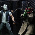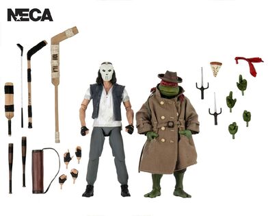 One poseable, highly articulated figurine of Casey Jones in his trademark hockey mask and one figurine of TMNT Raphael