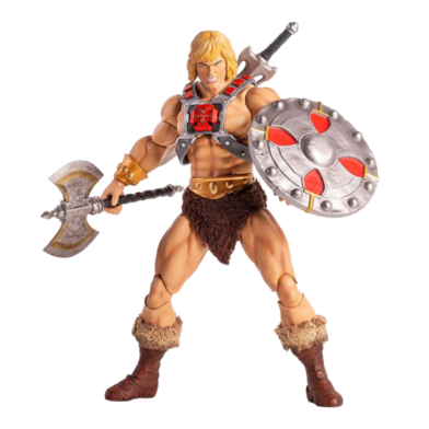 This He-Man Sixth Scale Figure features over 30 points of articulation, fabric costume elements, and multiple accessories including three swappable portraits and an array of weapons.