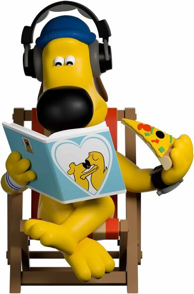 It’s not easy being Bitzer. The farmer’s faithful dog and a good friend to Shaun, Bitzer is an ever-suffering sheepdog just doing his best to keep Shaun’s pals out of trouble. Bitzer sits in a lawn chair at 4.5 inches tall. He sits in a brown lawn chair wearing a number of accessories including a big watch, black collar, blue and white wristband, blue beanie hat and black and grey headphones. He holds a slice of pizza in one hand and a book in the other. The window box illustrates Bitzer’s natural habitat.