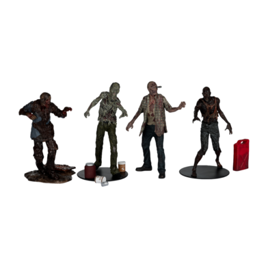 Set Includes 4 Walkers: RV Walker, Water Walker, Mud Walker and Charred Walker with accessories and bases. Based on the hit AMC series The Walking Dead.