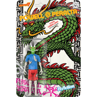 This 3.75" scale, articulated Powell-Peralta ReAction Figure of Steve Caballero features a skeleton body with a green dragon head inspired by the logo on his signature deck.