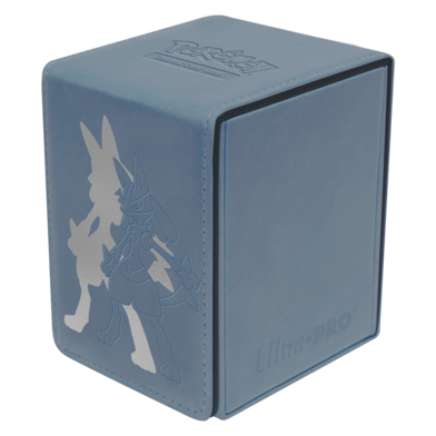The Alcove Flip Box for Pokémon features a debossed image of Lucario on a leatherette finish with premium foil detailing. A strong magnetic closure keeps your cards safely secured inside, and dual thumb notches offer easy access to your deck. This Deck Box® holds up to 100+ standard size trading cards double-sleeved in Ultra PRO Deck Protector® sleeves.