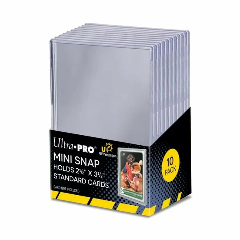 Holds 2-1/2″ x 3-1/2″ (63.5 mm x 88.9 mm) standard size cards with UV Protection. Two-piece ultra-clear holders with snap-tight closure and minimal trim. Can be stacked for easy storage and transport. This holder provides UV- Resistant, No-PVC, and acid-free protection. Pack includes ten (10) UV Mini Snaps.