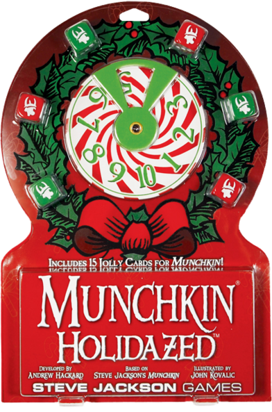 Holidazed pack combines eleven new cards with four reprints from the hard-to-find Munchkin Holiday Surprise, a candy-themed Level counter, and six red-and-green festive 14mm dice.