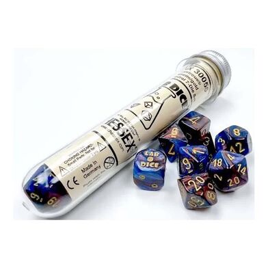 Set of Polyhedral Lab Dice from Chessex for classic tabletop RPG and Board Games. Each die comes in a tube and includes a set of 7 dice 1 each of d4, d6, d8, d10, d10 percentile, d12, d30