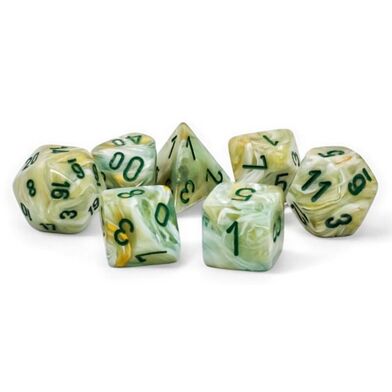 Contains 7 Marble Green Dice with dark green numbers