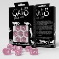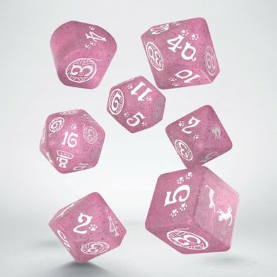The most fluffy of furs! Q WORKSHOP presents the never-before-seen CATS Dice Set: Daisy. This totally new design shows playful cats and their everyday activities! Each of the 7 dice has different felines posing on the highest face. The shimmering-pink material and white paintings bring about cats’ soft fur, which simply begs to be petted. Give them attention, and they’ll make it worthwhile!