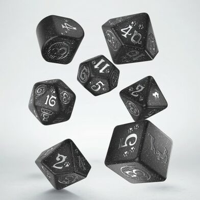 Behold the CATS Modern Dice Set: Waffle! These dice are as black as night, sparkling with many tiny stars; an effect provided by the material being mixed with glitter dust. The engravings are painted matte silver, making them mystical and showing playful cats in their everyday activities. Just the way you love it, just the way you need it!