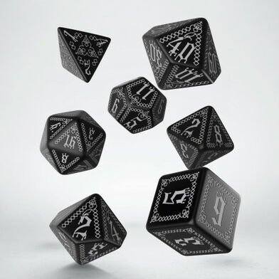 We produce dice in many colors, but sometimes you need to find your inner darkness and sink the design department of Q WORKSHOP in the Darkness with a capital "D". That's all to create the dice dedicated to the Paizo Inc. campaign Pathfinder Adventure Path: Carrion Crown. This, so far, the darkest adventure cycle is something new, because the amount of horror has been set to scare the players. At the same time, they have a wonderful, though bloody, field day with this. So we created black dice from the best material and ornamented them with silver digits and festoons. Everything has been packed into an elegant box in dark colors. Thus, we want to give players a set durable as a vampire mausoleum, werewolves claws and tips resistant and as legible as the obituary in the newspaper. We want the throwing of these dice to be like rolling tombstones, scary but fun. It's set for ghosts, monsters and other undead slayers. We assure you that good throws will help you in this campaign, and our dice will work. Similarly, it will be in other adventures, because as you know, our dice can survive everything, even six sequels of a good horror tale.