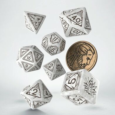 A legendary witcher. Inspired by The Witcher franchise, this dice set is dedicated to Geralt of Rivia — also known as Gwynbleidd, the White Wolf. The set contains 8 pieces; 7 polyhedral dice, and a metal coin featuring Geralt’s depiction, which acts as a D2. Each die is painted pearl-white with brown engravings. The highest value faces and coin reverse display the Wolf School symbol.