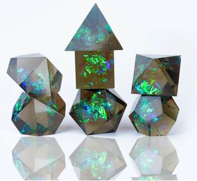 A set of 8 stunning dice. This premium set is contained in a visually pleasing plastic tube with a screw top lid. Each Dice set contains 2D20, 1D12, 1D10, 1D100, 1D8, 1D6, 1D4