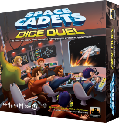 Space Cadets: Dice Duel – the "Team vs. Team, Real-time, Dice-Rolling Game of Starship Combat!" – pits two spaceships against one another in quick-paced combat. The players are divided into two teams, each team playing the crew of a ship and winning or losing together based on how well they perform. The game ends when one side destroys their opponent by causing four points of damage through torpedoes or mines. Each ship has six Bridge Stations: