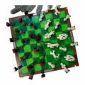 The 18" square chess board features a wood-like frame around a playing surface of ‘‘grass’ in textured shades of green, surrounded by Minecraft logos in a metallic finish, suitable for the game of kings (and Steves).
