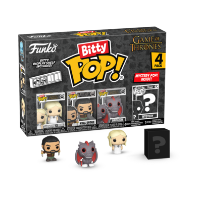 This 4-pack includes Bitty Pop! Daenerys Targaryen, Bitty Pop! Khal Drogo, Bitty Pop! Drogon, and a mystery Bitty Pop! figure.