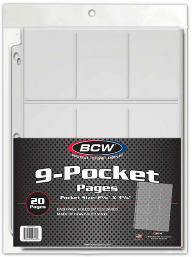 The BCW 9-Pocket page is made from high clarity double polished clear vinyl. This product features high clarity and top loading pockets with strong welds. BCW Pro 3-Pocket pages fit all standard 3-ring binders and albums. Use the 9 pocket page to protect store and display collectible trading cards like: baseball cards, basketball cards, football cards, Magic the Gathering, Pokemon, YuGiOh, and others.