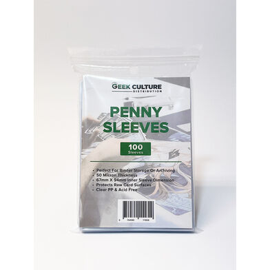 Keep your prized trading cards in pristine condition with our pack of Geek Culture 100 Penny Sleeves. Each sleeve offers reliable, lightweight protection from dust, scratches, and everyday wear. Notably, these penny sleeves are slightly shorter than most options on the market, making them perfect for folks who enjoy using penny sleeves in their binders.