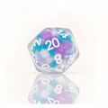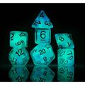 Glow-in-the-dark beads inside translucent resin. Set of 7 polyhedral dice plus 1 extra D20. Packaged in a flat-bottom tube, so you can easily carry and store your dice. Colors: Blue and purple beaded glow in the dark dice set D20 size: 22mm