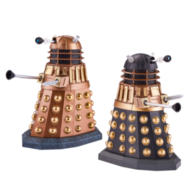 In the episode, Rose Tyler has been captured by the Daleks and the Doctor must do some fancy flying to find her. Emerging from the TARDIS, he taunts the Daleks to find out information and is staggered to find them worshipful of something or someone. The source of this enthral is revealed to be the self-proclaimed ‘Emperor of the Daleks’, a survivor of the Time War. This set includes a black and bronze Imperial Guard Dalek and a fully bronze Dalek – all part of the massive Dalek army that has been created by the Emperor over the centuries.