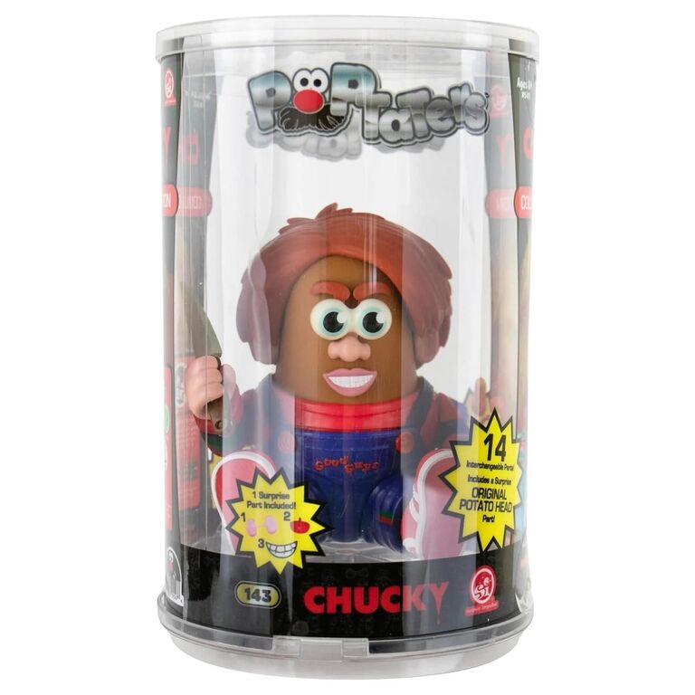 Poptaters Chucky includes 14 removable, interchangeable parts including one surprise Potato Head original part! The 4 inch (10cm) body nearly doubles in size when accessories are on.