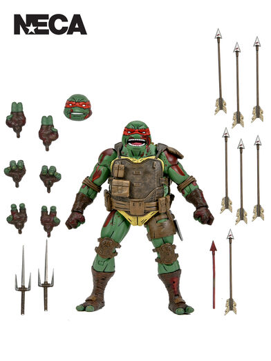 From the Teenage Mutant Ninja Turtles comic book series, The Last Ronin! In a future NYC far different than the one we know today, a lone surviving Turtle goes on a seemingly hopeless mission to obtain justice for his fallen family and friends. Based on issue #2 of the comic, this figure depicts Raphael’s final fight with the nefarious Foot Clan and features battle-damaged deco.
