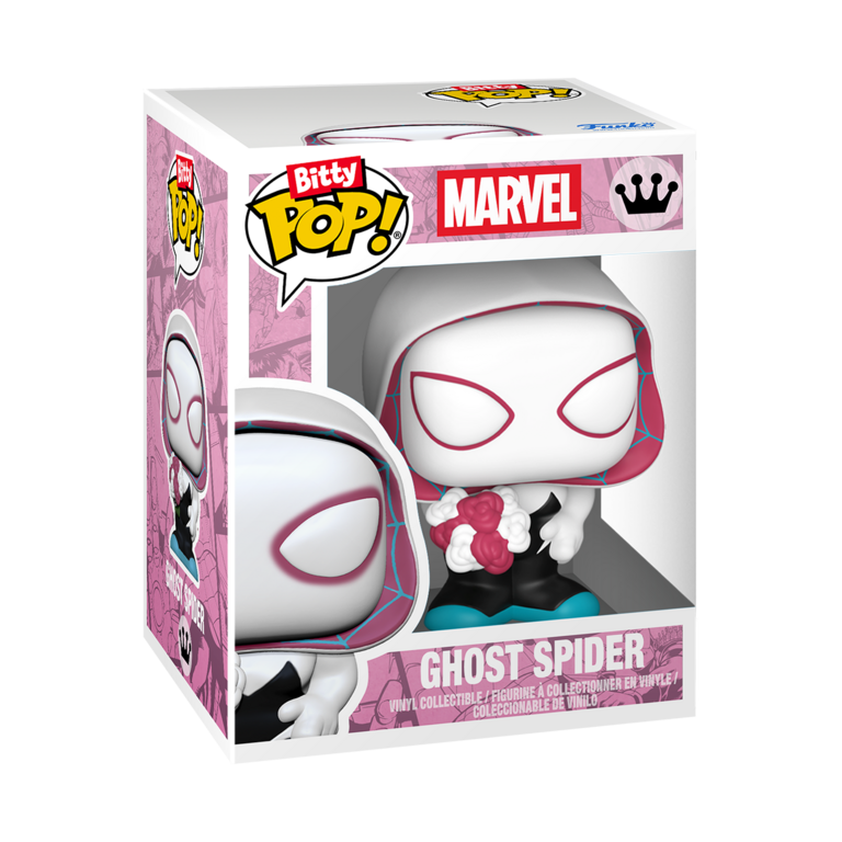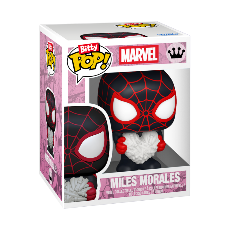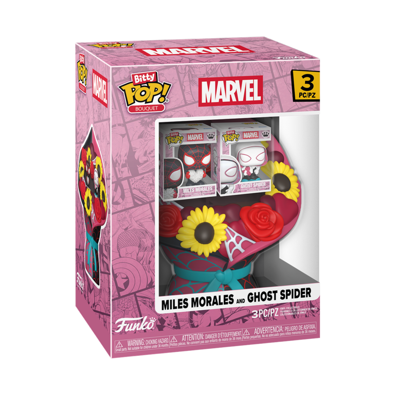 Expand your Marvel collection with this Bitty POP! Bouquet, featuring Bitty POP! Miles Morales and Bitty POP! Ghost Spider in an adorable Valentine's Day motif. The Bitty POP! Bouquet can display two Bitty POP! figures – mix and match with more of your favourite Bitty POP! characters for endless combinations!