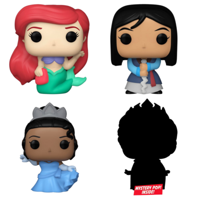 This 4-pack includes Bitty Pop! Ariel, Bitty Pop! Mulan, Bitty Pop! Tiana, and a mystery Bitty Pop! figure.