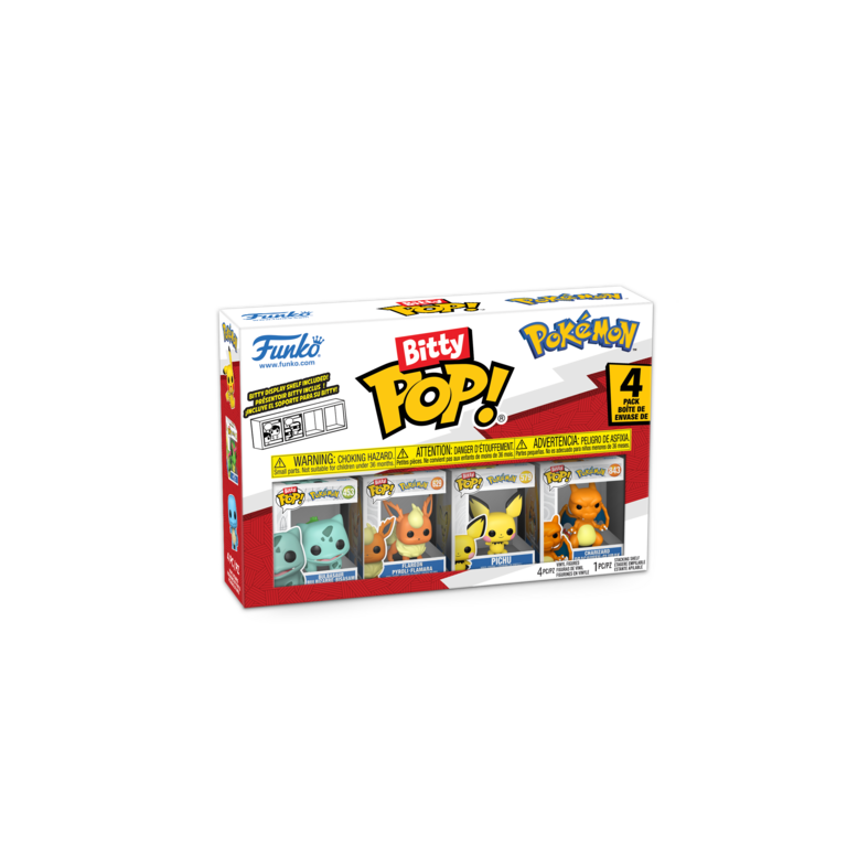 This 4-pack includes Bitty Pop! Bulbasaur, Bitty Pop! Flareon, Bitty Pop! Pichu, and Bitty Pop! Charizard.