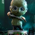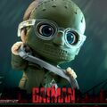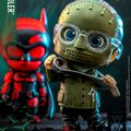 The Riddler Cosbaby Collectible Figure has the Riddler wearing glasses on his mask and green attire with question mark logo, rolling out duct tape.