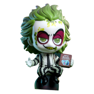 While sitting on his own grave, this Beetlejuice Cobaby features his iconic wild green hair and tattered black-and-white striped suit, holding the 'Handbook For the Recently Deceased'.