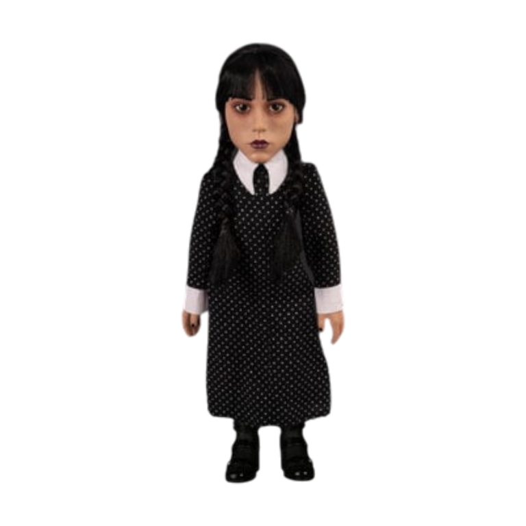 At approximately 18" tall, the MDS Roto Plush Wednesday is outfitted in her signature long-sleeved polka dot dress paired with Mary Jane shoes, and features sculpted details and rooted black hair styled in her classic braids.
