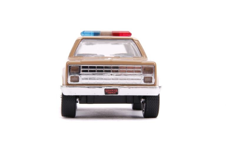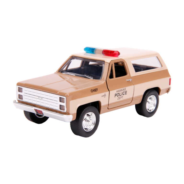 Make your escape from the Upside Down with the Stranger Things 1980 Chevy K5 Blazer. Featuring styling cues directly from Stranger Things, this collectible die-cast replica is sure to be a standout in any Stranger Things collection! Collect them all!