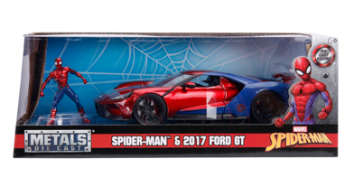 This 2017 Ford GT takes its styling cues directly from the friendly neighborhood web-slinger, Spider-Man! The 1/24th scale vehicle features a die-cast body with a detailed interior and opening doors, hood and an adjustable spoiler, as well as working wheels with rubber tyres. The officially licensed vehicle also comes with a 2.75” Spider-Man die-cast figure, so you can display the web-slinger next to his ride.
