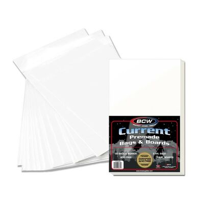 Protect your current comics with these pre-made kits with boards pre-loaded into bags. Just drop a comic in, close the flap and you’re done. The BCW Current Comic Backer Boards are made from a full 24 point solid bleached sulfate, coated on one side with a buffered 3% calcium carbonate and are precision cut to size. The BCW Current Comic Bags are an acid free, archival quality product made of crystal clear polypropylene. Bags are 2 mils thick and have a 1 1/2 inch flap for closure. Sold in packs of 50.