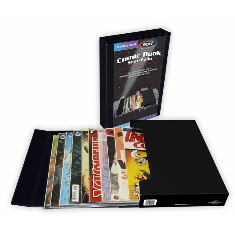 The BCW Stor-Folio is a drop back portfolio box. It is an unequaled transportable comic book storage device. The Stor-Folio will hold up to 15 bagged and boarded comic books, or up to 20 loose comic books. The Stor-Folio can be shelved in a bookcase, or carried in your backpack to safely transport your comics to your favorite comic book convention. You can also store up to eight Comic Book Stor-Folios in a BCW magazine box. Both the front and the spine features clear pockets into which a piece of artwork will fit. It also features a secure magnetic closure. It is easy to open, but will not accidentally unfasten. The outside dimensions are: 8 x 11-1/4 x 2 inches and will hold about anything up to 7-3/4 x 11. Ideal for transporting and storing comic books. Sized for Current and Silver Age Comic Books. Holds up to 15 bagged boarded comics or up to 20 loose comics. Clear pocket on front and spine for artwork or indexing. Strong magnetic closure. Exterior Dimensions: 8 x 11 1/4 x 2. Interior Dimensions: 7 3/4 x 11 x 1 1/2.