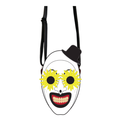 This twistedly stylish purse is made with high-quality Vegan Leather and features the unmistakable mug of Art the Clown, this time with a floral twist. His signature smirk and top hat are made in a layered design, and the bag features removable flower-shaped glasses, which are a magnetic keychain-style attachment, so you can wear the bag with or without his accessory.