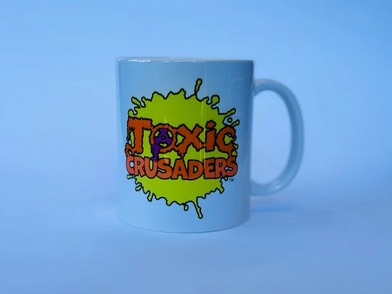 1990s Toxic Crusaders logo printed on a 325ml (11oz) coffee mug.