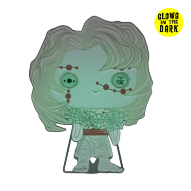 This Pop! Pin features glow-in-the-dark enamel fill, silver-colored hardware, and a built-in stand.