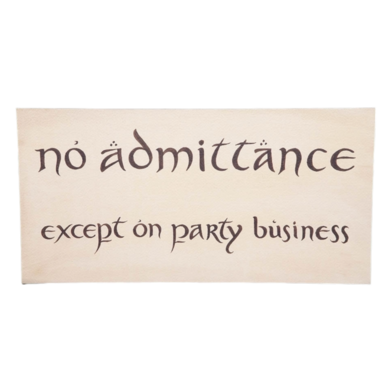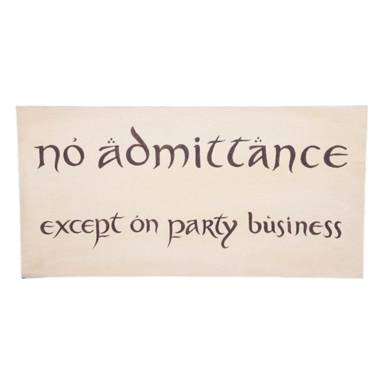 Increasingly irritated by the attention attracted by the celebrations of his eleventy-first birthday, Bilbo Baggins is forced to take drastic measures (in Hobbit terms) and asks Frodo to hang a sign on the gate: 'No Admittance Except on Party Business'.