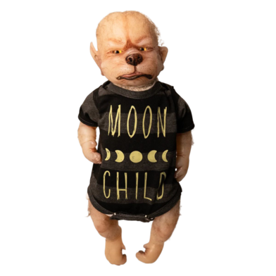 Toby is the size and weight of a new born with added spooky charm! He features a solid silicone head, arms and legs attached to a weighted plush furry body, giving the look and feel of holding a real live baby werewolf!